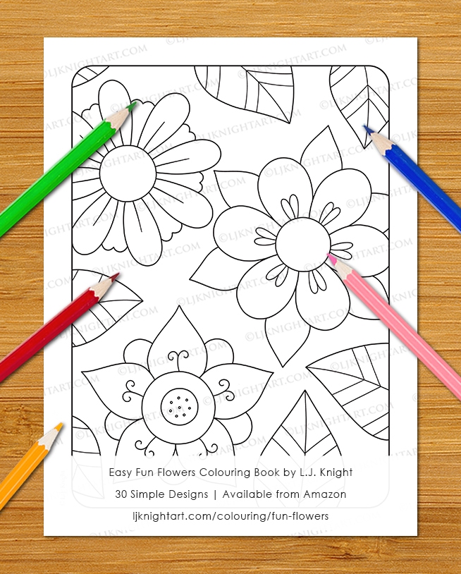 Easy Fun Flowers is book 17 in the LJK Colouring Books series, which has a growing range of colouring designs for all ages. See the other books here.