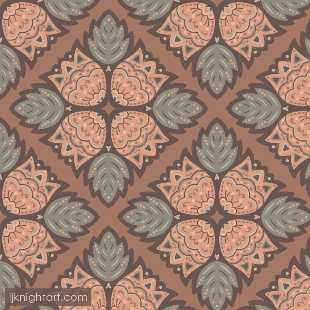 Anyway, this pattern is one of the first new designs I’ve made since getting back into it. It is drawn in a generic folk art style with brown and green flowers and leaves in a diamond motif, using Procreate on my iPad.